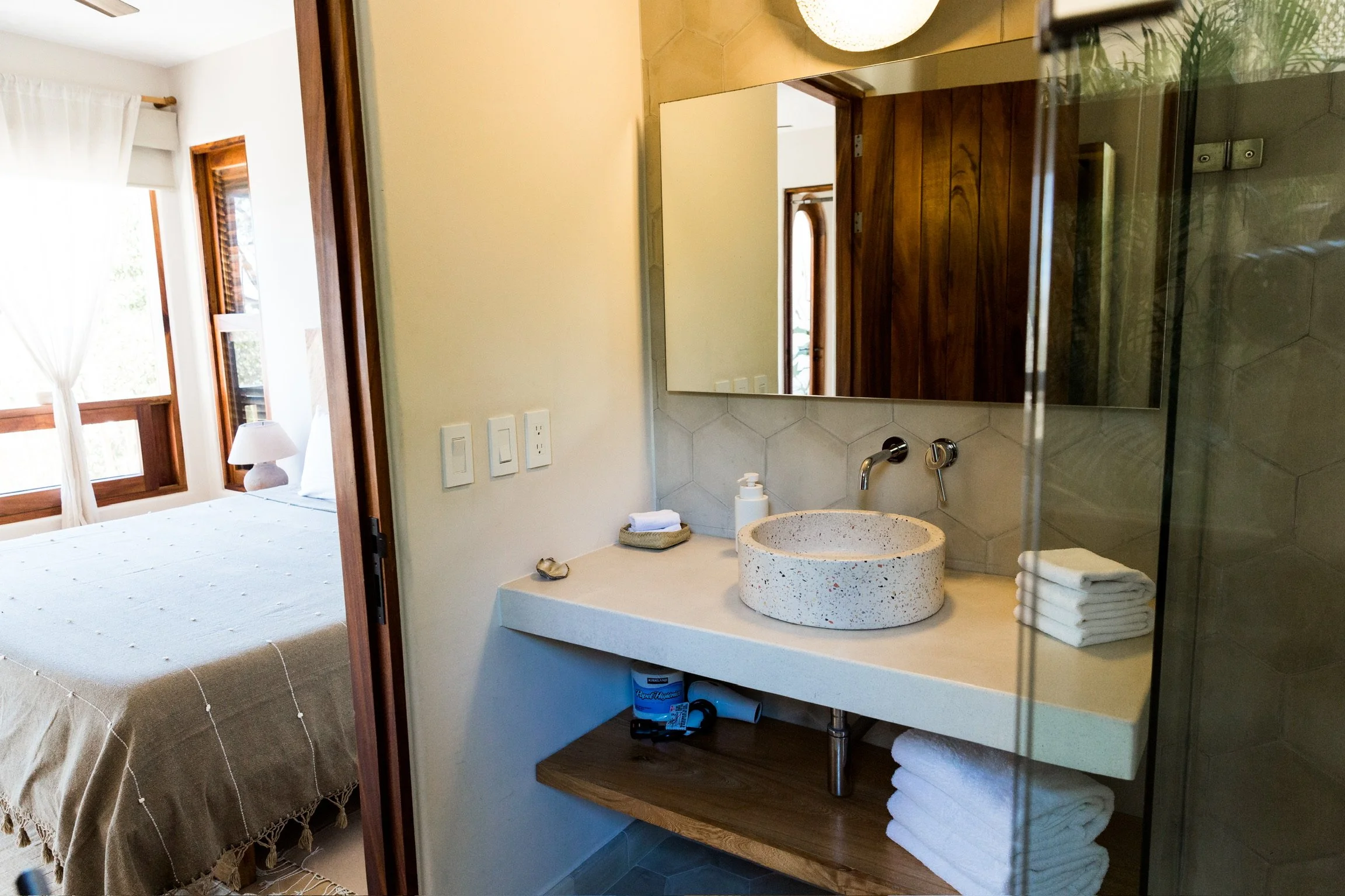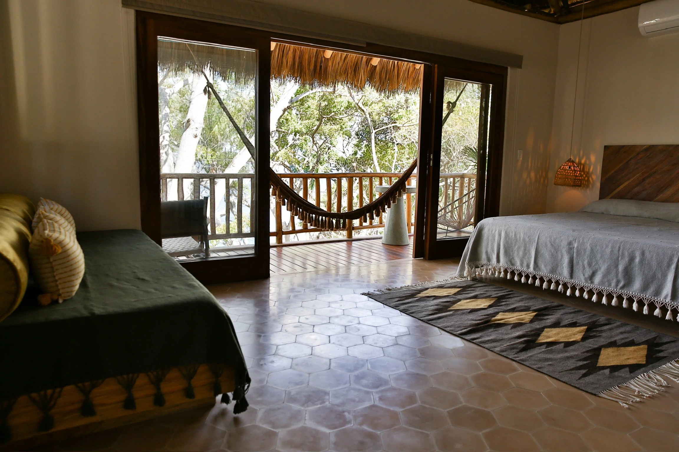 The casita offers a more spacious option for 3 guests in a large shared bedroom including 3 twin beds, shared on-suite bathroom, and terrace. Also includes mini Bar, AC, High Speed Wifi, in room filtered water, Nespresso, blackout blinds, and yoga mat.